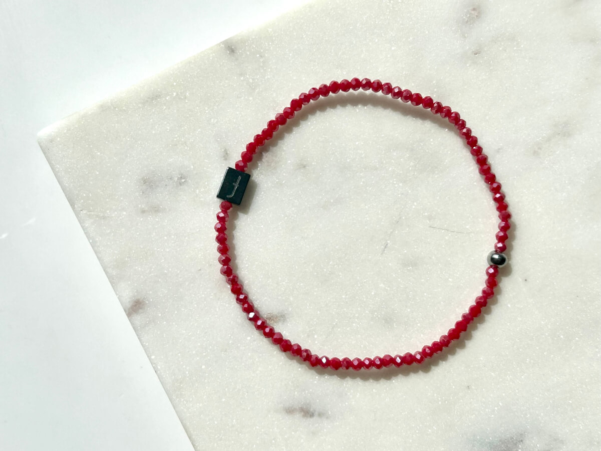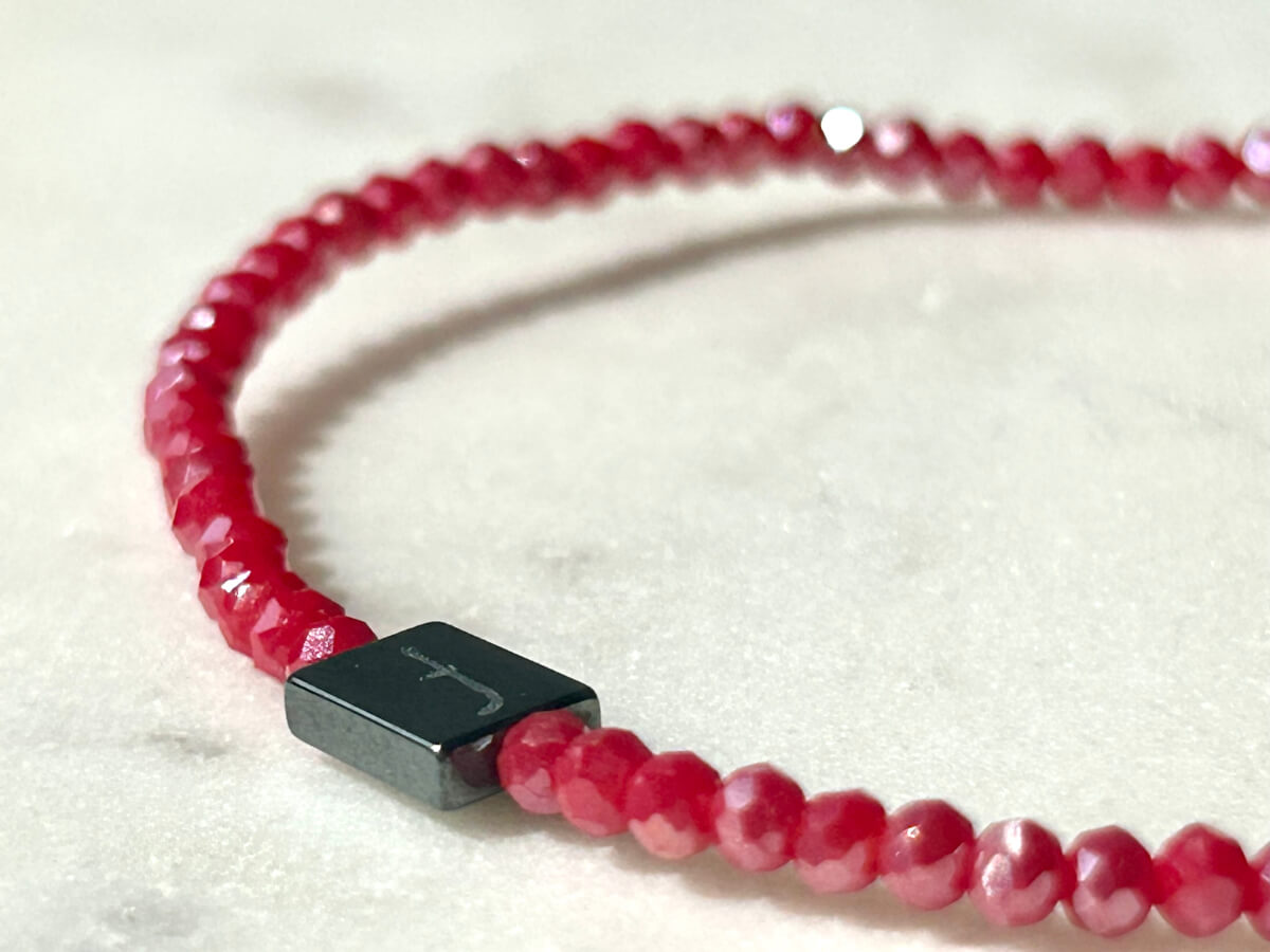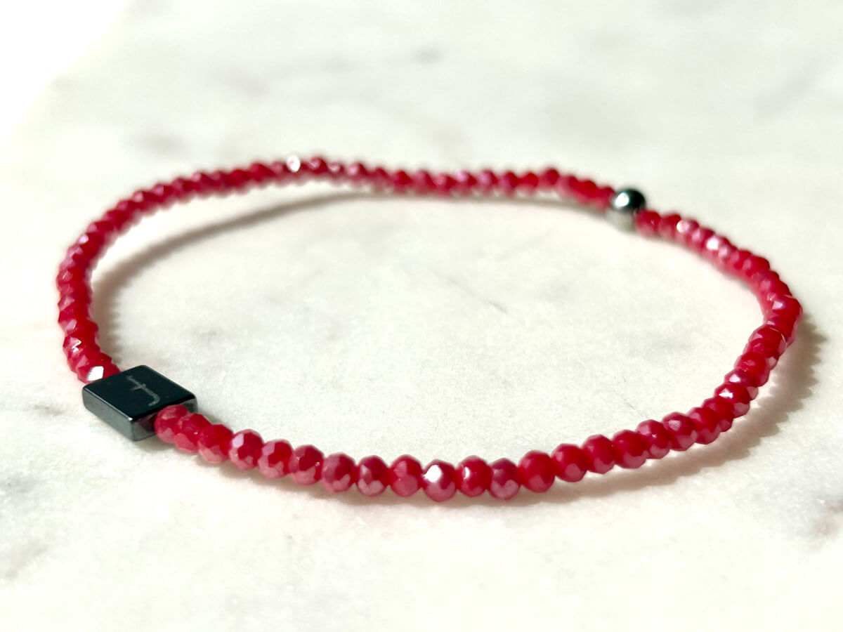 piros fazettált csiszolt üvegkristály gyöngyökből készült gumis karkötő. Gyöngyméret: 2 mm, L(19-20) -es méret.